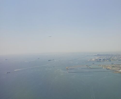 2023年5月秋田湯けむり湯治の旅 ※離陸時に写真撮影したり音楽を聴くことは可能です。 無事に飛び立ち、どんどん都会から離れていきます。 向こう側にも同じく飛び立った飛行機が見えます。