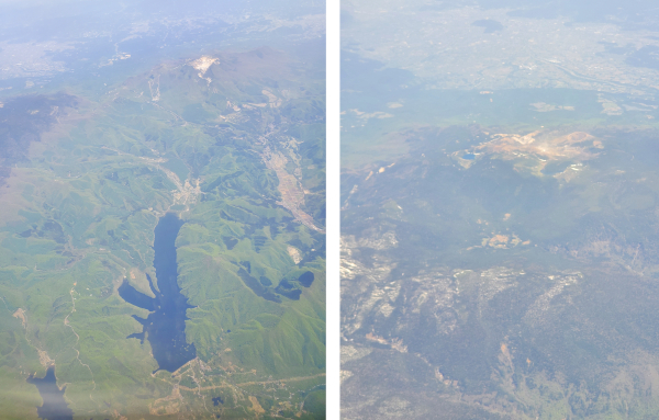 2023-06-04 檜原湖と磐梯山 Discover JAPAN 2023年5月秋田湯けむり湯治の旅 猪苗代湖の次に見えてくるのは檜原湖とお釜がぽっかり空いた磐梯山 ダイヤモンドヘッドのような緑色のクレーターではなく、活火山らしく茶色 羽田~秋田路線は、猪苗代湖の上空を飛ぶらしい。 そういえば子供のころ、上空を飛行機が通過するのを見上げていました。 あの頃は旅行なんてとても行ける体質ではなかったので、将来こんなに旅行好きになるなんて考えてもみなかった。 今では全国どこでも行っちゃうし、海外まで行っちゃうもんね。
